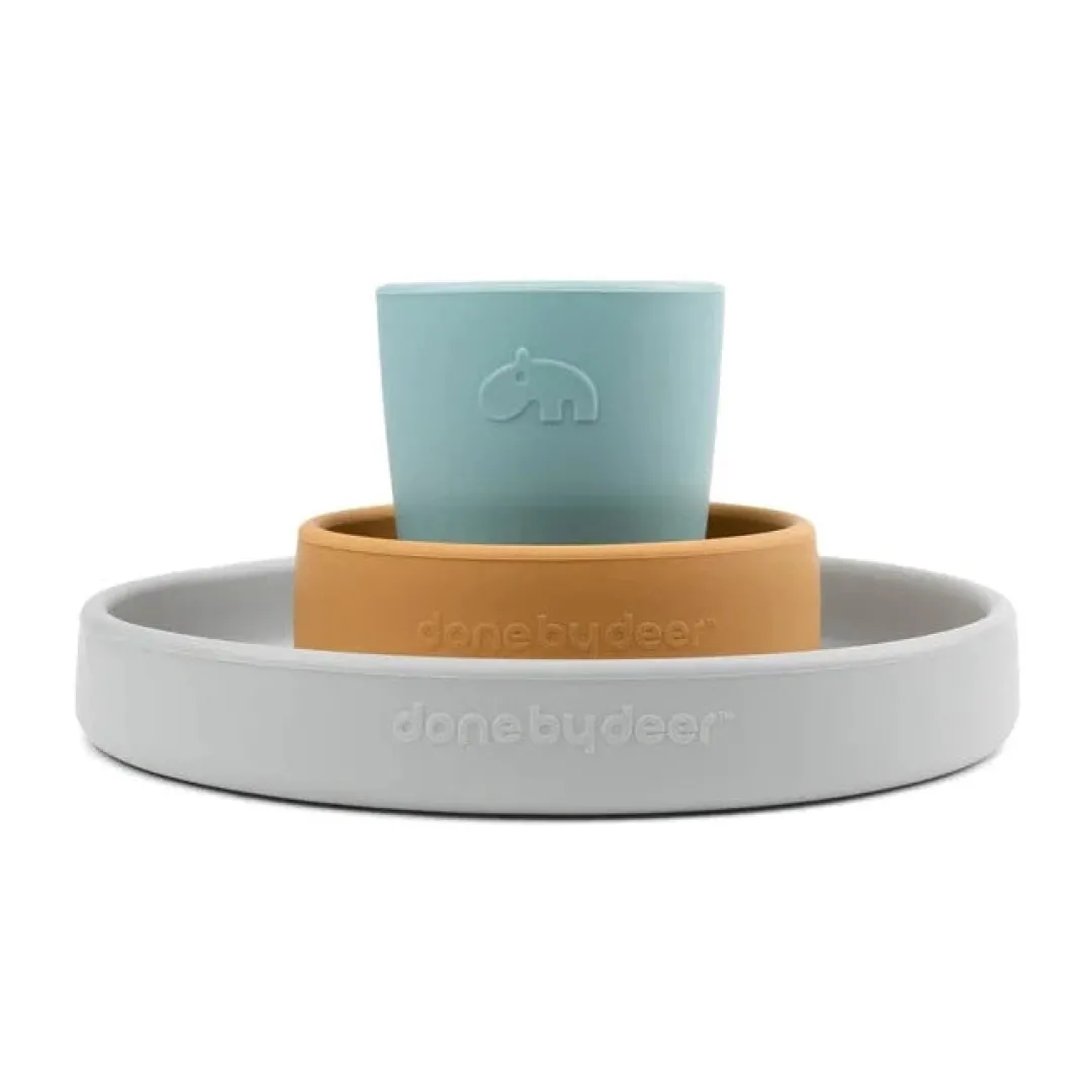 The Silicone dinner set with happy colours will make mealtime fun. The practical anti-slip and easy grip silicone starter set includes a kids’ plate, a bowl and a mini mug. Perfect tableware for babies and toddlers.
