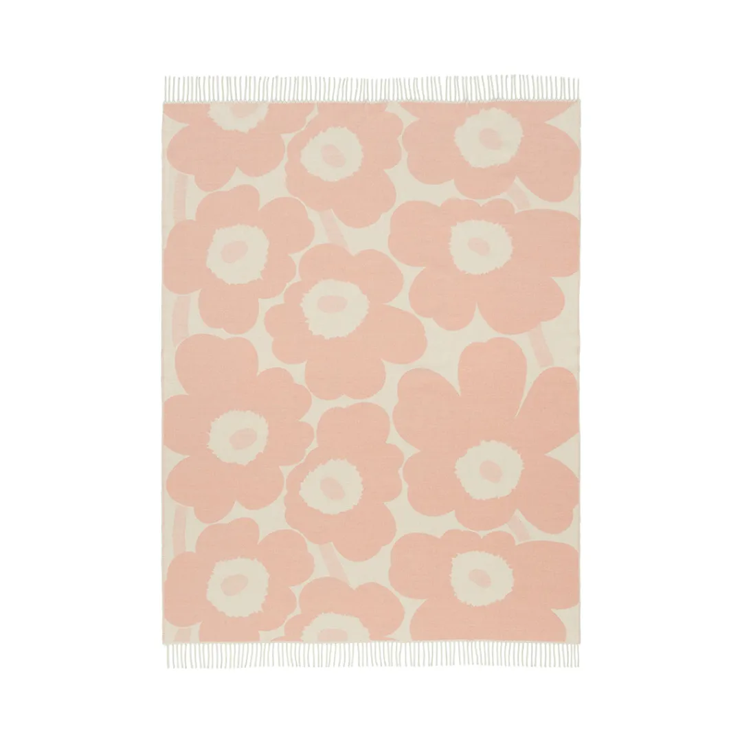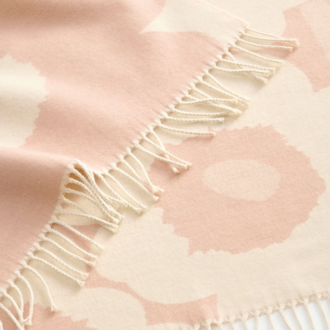 A beautiful, soft addition to your home, the Unikko pattern blanket is made of a wool and cotton blend with a jacquard knit. The blanket has fringes at the ends. The pattern’s colors are reversed on the other side of the blanket.