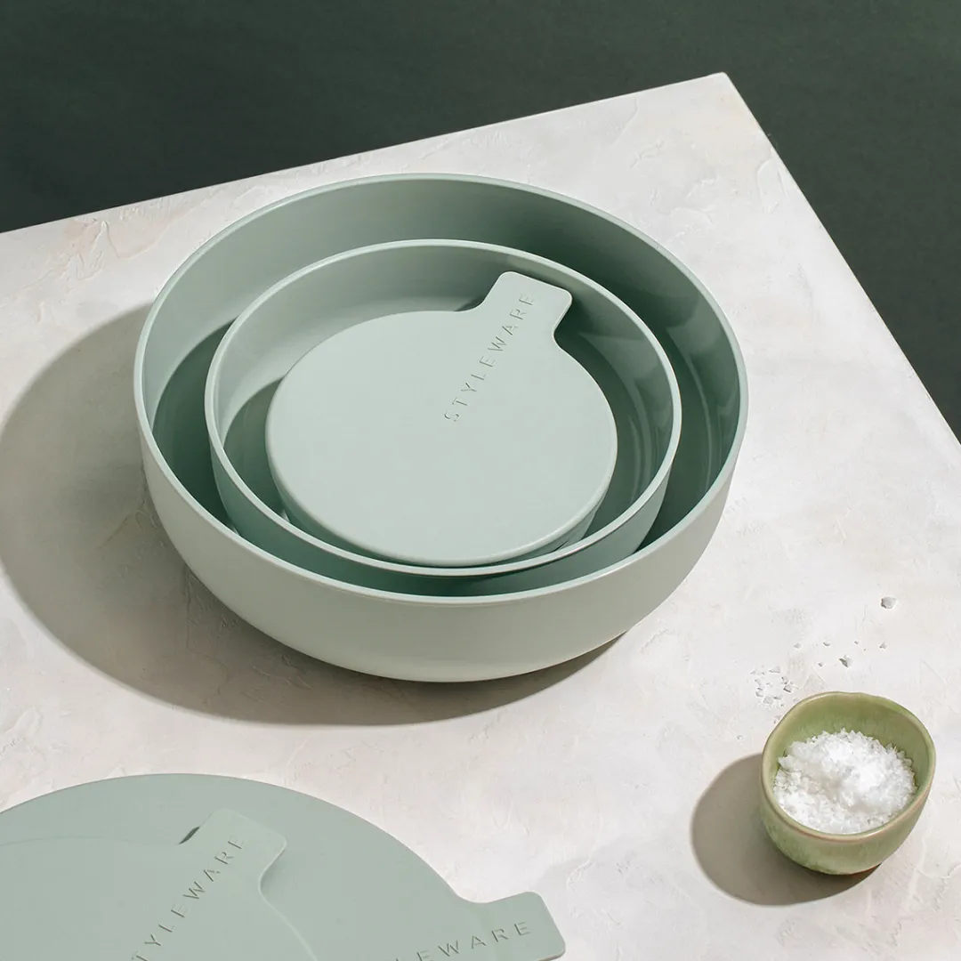 The 3 piece set by Styleware in Eucalyptus is a great starter set to the range or addition to your existing collection. Take on picnics, pack your lunch, take your favourite salad to a BBQ, or store kitchen leftovers, with each bowl in the Styleware Nesting Bowls Collection being snap-tight, lightweight, and meant to make your day, every day.