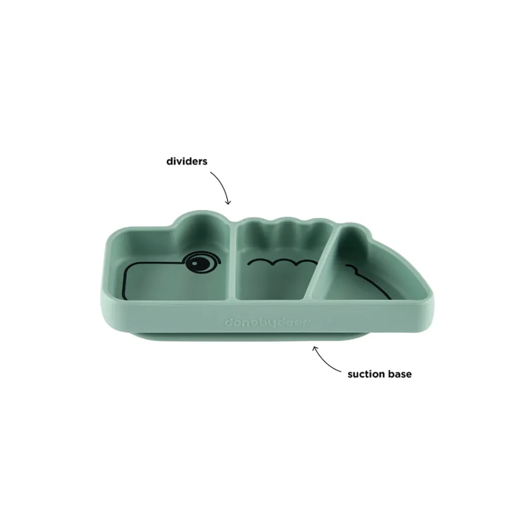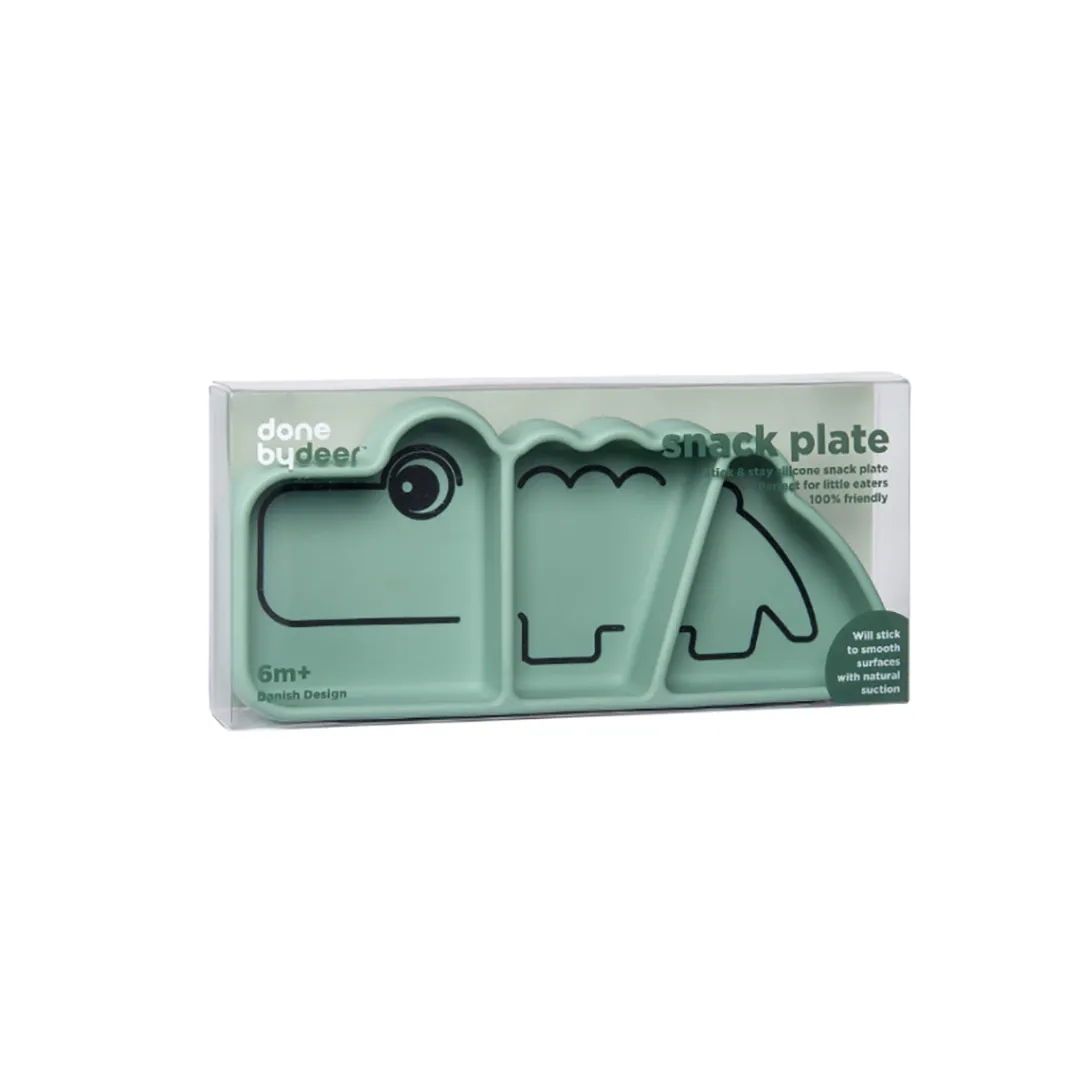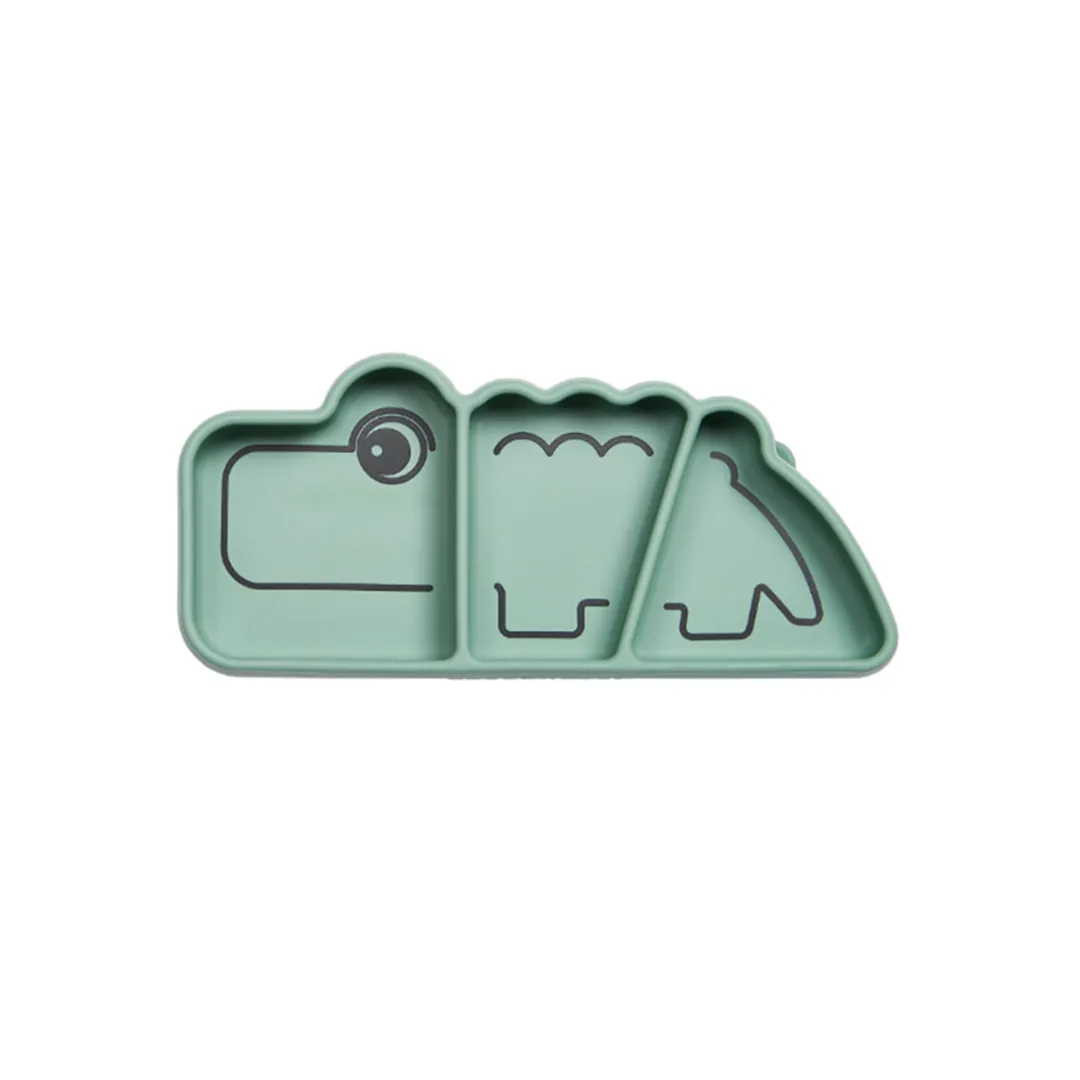 The crocodile stick & stay snack plate with three separate compartments will stay in place and help little eaters snack away. Croco is ready to make snack time fun!