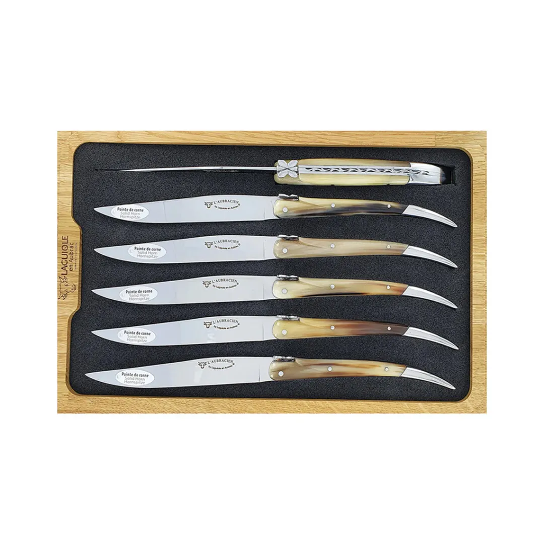 Each set of 6 Laguiole steak knives boasts high-quality stainless steel blades for precise, long-lasting cutting performance. The handles made from horn tips, provide a comfortable grip while double bolsters add elegance and sophistication.