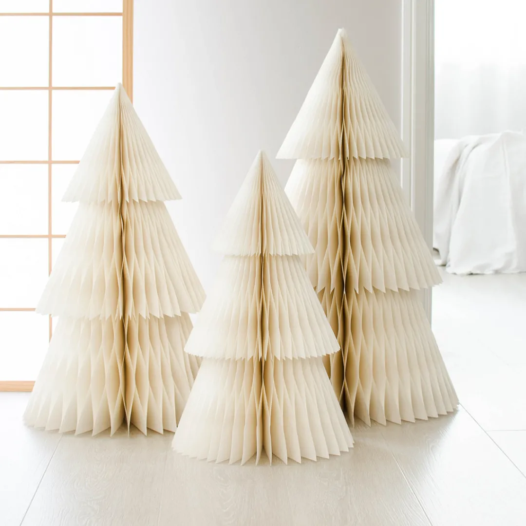 These stunning handcrafted paper Deluxe Standing Trees are the perfect decor piece for Christmas. These trees are a classic Scandinavian silhouette, extremely minimalistic and features sustainable paper in Off-White with silver glitter edge. These trees create a magical feeling in your home by themselves, or with multiple trees together! The trees all fold away with a magnetic closure for easy storage after the festive season. Each tree is hand made from FSC certified paper.